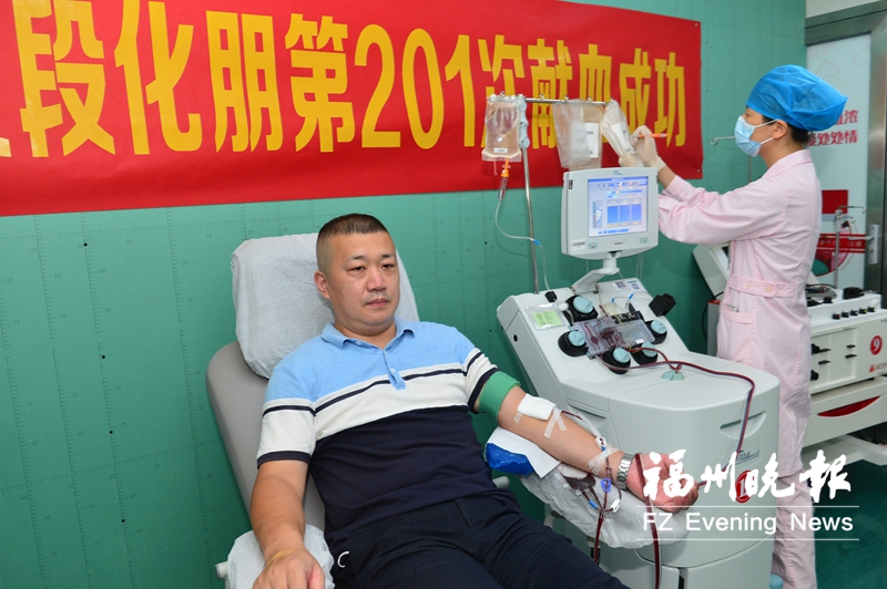 7月18日,段化朋带着自制的横幅来到福建省血液中心,第201次参加无偿献血。 从部队后勤工作人员到省自然资源厅后勤工作人员,20多年来,段化朋用热血让生命更有意义,并带动亲朋好友献血。
