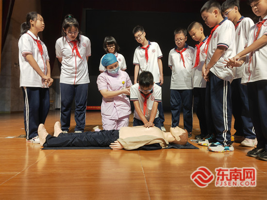 在医护人员指导下,同学们现场进行实操演练。 石狮市总医院 供图