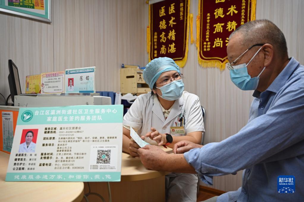 10月9日,在福州市台江区瀛洲社区卫生服务中心,家庭医生陈铭为签约的居民讲解家庭医生签约服务政策。新华社记者 姜克红 摄