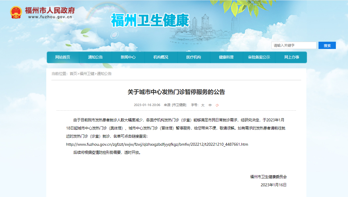 由于目前福州市发热患者就诊人数大幅度减少,各医疗机构发热门诊(诊室)能够满足市民日常就诊需求,经研究决定,于2023年1月18日起城市中心发热门诊(奥体馆)、城市中心发热门诊(晋体馆)暂停服务,给您带来不便,敬请谅解。如有需求的发热患者请前往就近的发热门诊(诊室)就诊,名单见文末。