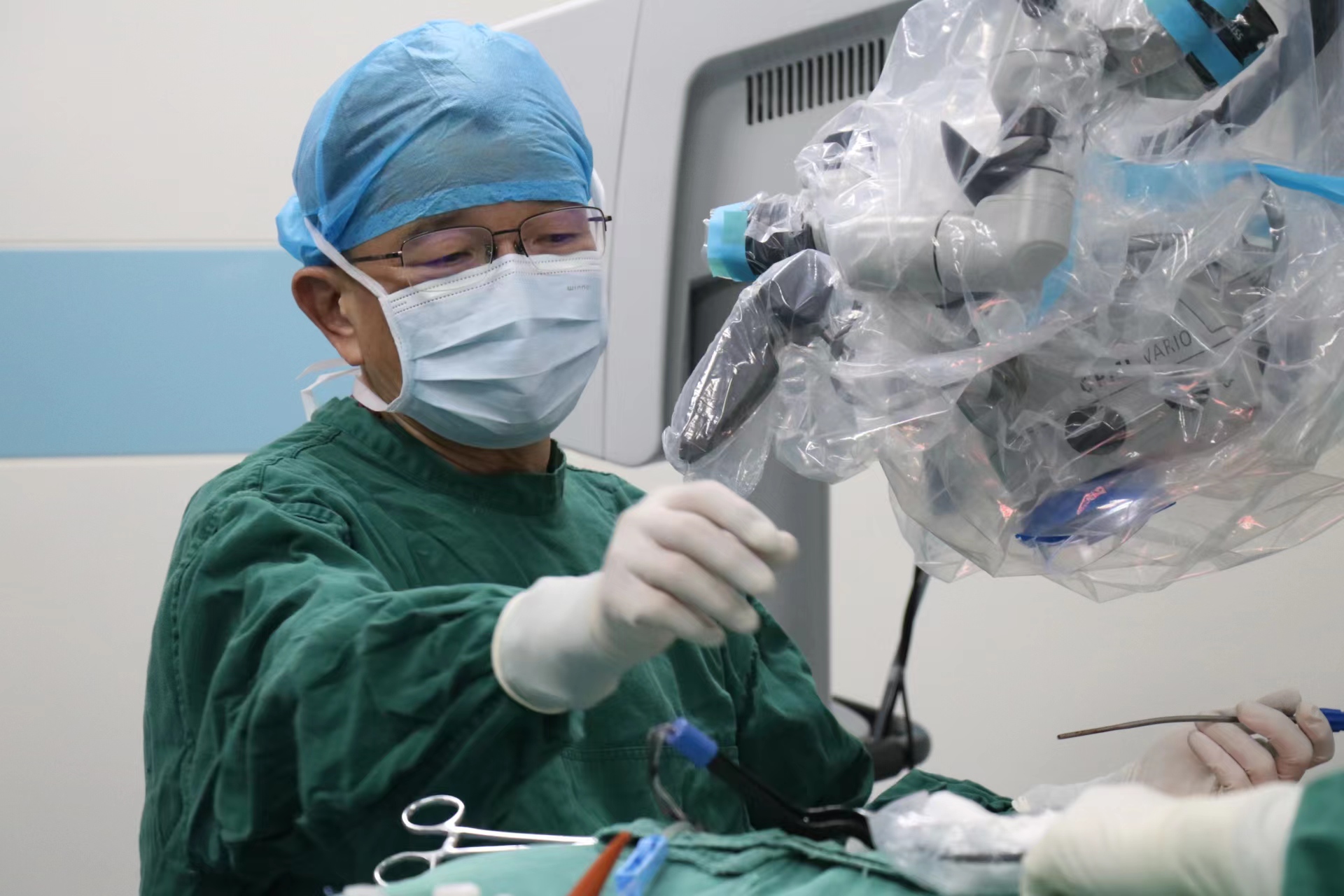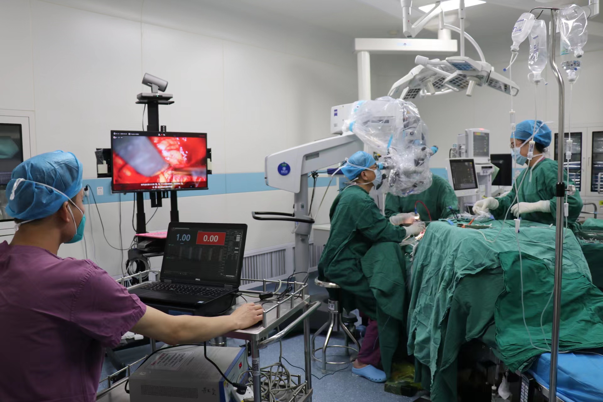 3月11日,在漳浦县医院手术室内,福建医科大学附属协和医院神经外科主任医师石松生、副主任医师陈阵、电生理监测技师魏小强正在为患者开展一台难度极大的听神经肿瘤摘除术,漳浦县医院神经外科医师团队在旁悉心学习。 王女士今年51岁,10年前开始出现右侧耳鸣,伴随听力下降,当时未予重视。由于2周前反复头痛难忍,才在家人的劝说下到漳浦县医院神经外科就诊。经完善相关体格检查及磁共振检查后,发现王女士右侧桥小脑角占位,占位体积如乒乓球大小,约4.5×3.2×3.0cm,并最终考虑为听神经瘤。 接诊王女士的主管医生将其相关病史及影像材料上传至协和医院神经外科,经远程会诊,石松生主任考虑肿瘤已造成患者耳聋伴轻度周围性面瘫,且已出现头痛呕吐等颅高压症状,手术势在必行。因患者病程长,肿瘤巨大,毗邻脑干生命中枢,周围神经血管丰富,考虑手术风险大,保留面神经功能难度系数较大,极大考验主刀医生的能力和水平,以及手术团队的协助精神。为确保手术万无一失,减轻患者就医负担,石松生主任决定带队到漳浦县医院为王女士进行手术治疗。