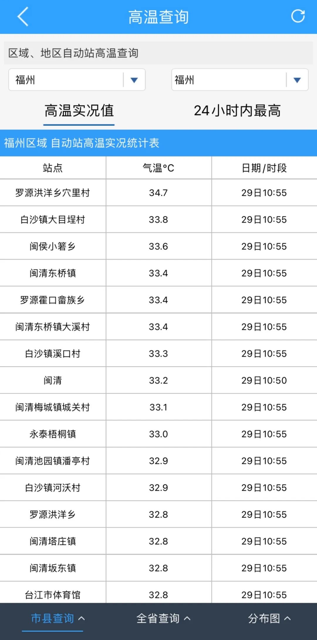 今天一起床就是三个字,热热热,今天10:55,福州多地气温就已达到30℃,罗源洪洋乡穴里村更是冲上34.7℃。