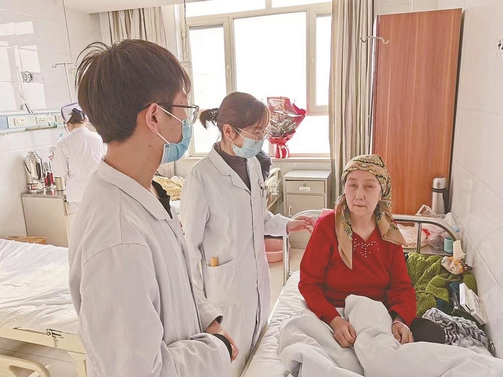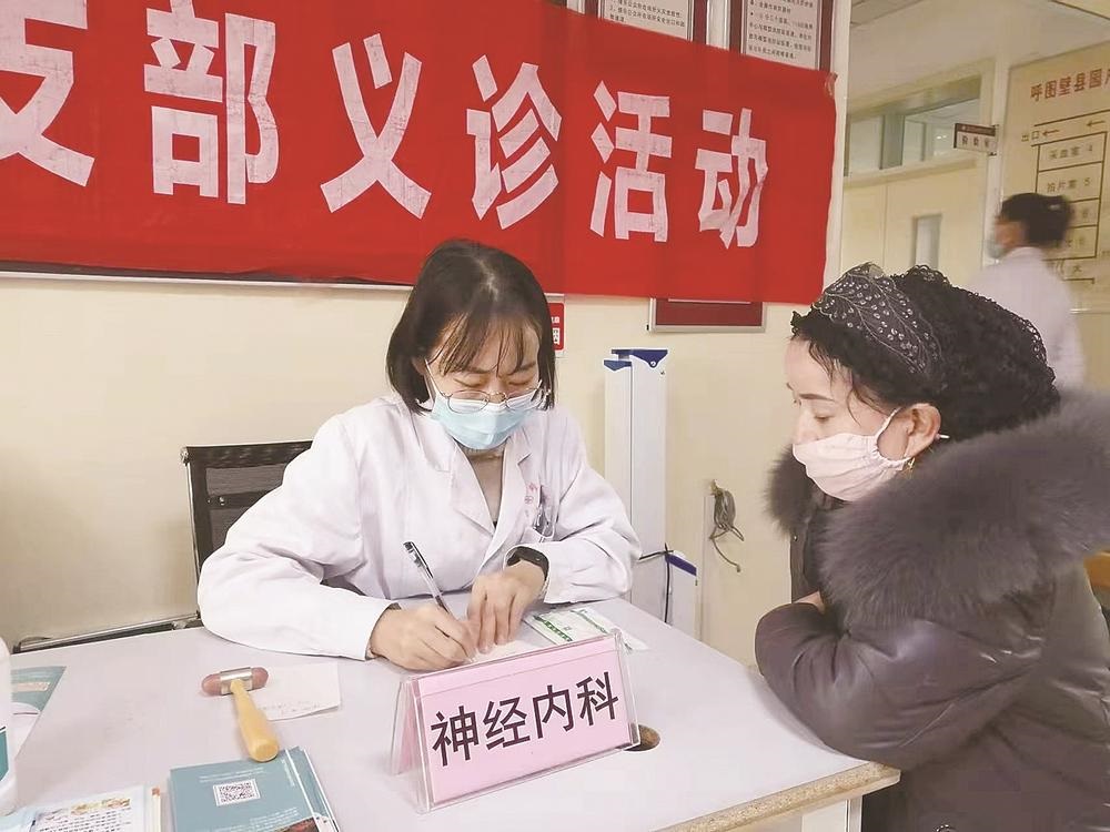 侯俊霞看诊 入科后,她就发现医院年轻医生缺乏系统培训,比如神经系统疾病临床思维尚未建立,疾病定位定性诊断模糊,医疗文书书写不规范……为了让年轻医生尽快提高临床诊疗技能,她坚持每天带领组上医生查房,在查房过程中手把手教学,仔细认真讲解分析,指导神经系统体格检查、诊断和治疗,有针对性地修改病历病程,在实操中提升病历书写规范性,并对科室其他治疗组的疑难危重患者进行指导。此外,她还积极参与医院院感防控建设,组织科室医生开展学术讲座、教学查房等。同时,还多次和同事、援疆医生一起下乡义诊,上门提供优质医疗服务。“希望在有限的时间内,推动呼图壁县人民医院神经内科青年医生快速成长、诊疗水平快速提升。”侯俊霞说。