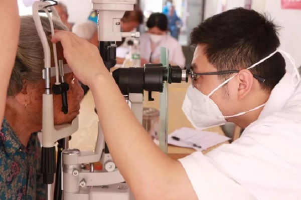 厦门大学附属厦门眼科中心医护人员在义诊活动现场为群众进行裂隙灯检查