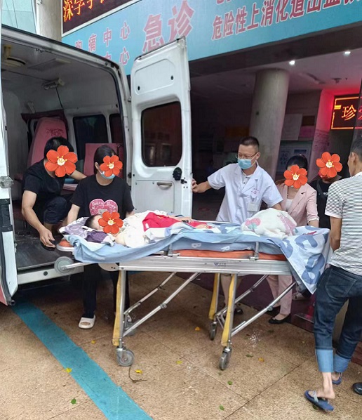 台风天也挡不住脚下急救路。迅速接诊、抢救,急诊医务人员为一位高热惊厥的小病人施行过吸氧急救处理后,快速转运到医院治疗。