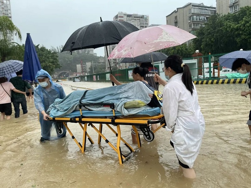 “一位孕26周的孕妇破水,立即出诊!”7月29日6时50分,接到福州120指挥调度中心通报后,福建省立医院南院急诊科的医护人员顶风冒雨,火速赶往孕妇家中。由于孕妇家属不在,只有邻居陪同,医护人员一方面进行紧急处理,监测胎心和孕妇生命体征;一方面安抚孕妇有些焦虑的情绪,将她平稳安全的送上急救车。 在台风“杜苏芮”影响下,暴雨导致路面积水,救护车不得已多次更换路线,并得到交警的全力协助。到达定点医院附近时,路面积水深达大腿,救护车无法通行,为了能及时送医,南院120医护和保安立即跳下救护车,用担架蹚水小心护送孕妇平安到达医院。 福建中医药大学附属人民医院 为迎战超强台风“杜苏芮”,福建中医药大学附属人民医院院领导和各部门深入一线仔细排查,全力保障极端天气下患者就医需求,确保医疗工作正常运转,保障在院患者生命安全。