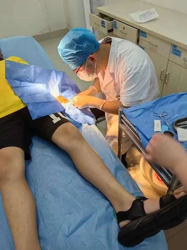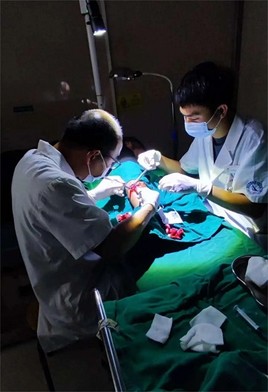 ▲金井中心卫生院的医护人员正在为受灾群众进行急诊手术,据悉该群众因被房门暴力夹击致双指指骨骨折