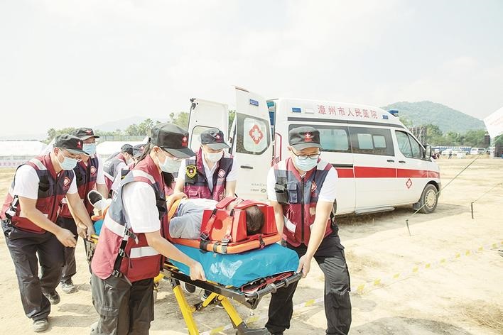 演练中,现场救援队将“重症伤员”立即转送“灾区医院”。