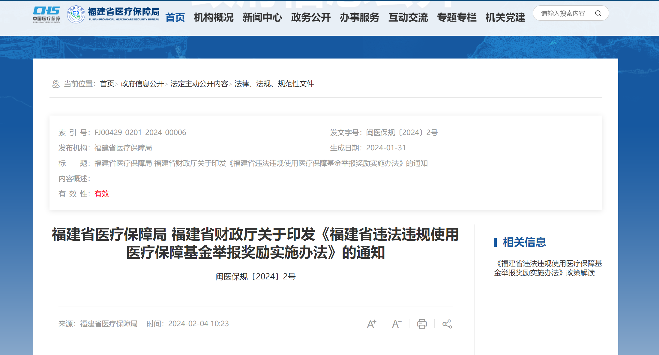 东南网2月22日讯(见习记者 唐宇松 本网记者 冯川叶)日前,福建省医保局、福建省财政厅联合印发了《福建省违法违规使用医疗保障基金举报奖励实施办法》(以下简称“实施办法”),明确了举报奖励适用范围,奖励的原则、条件、标准、发放和领取程序以及监督管理等有关内容。