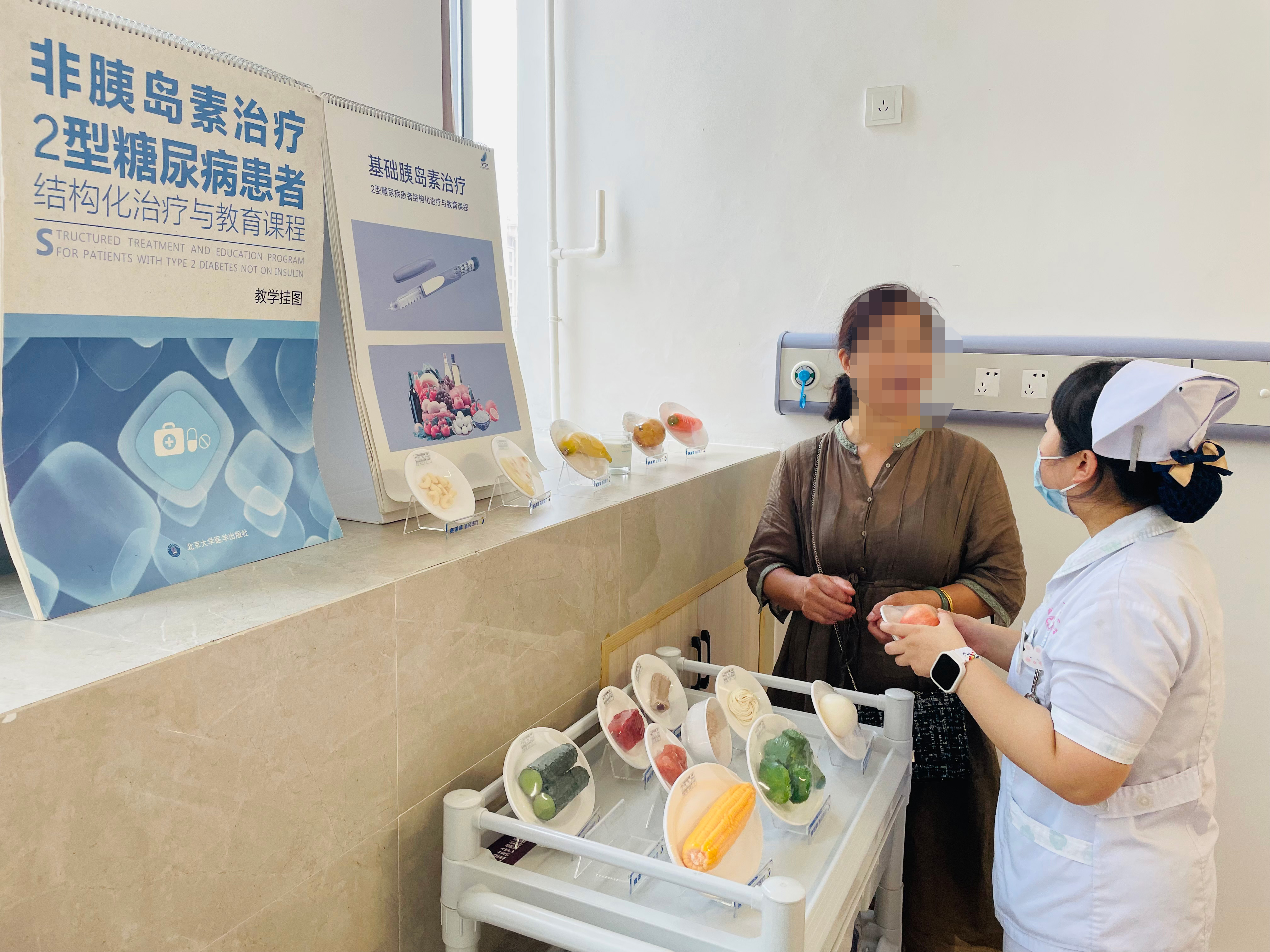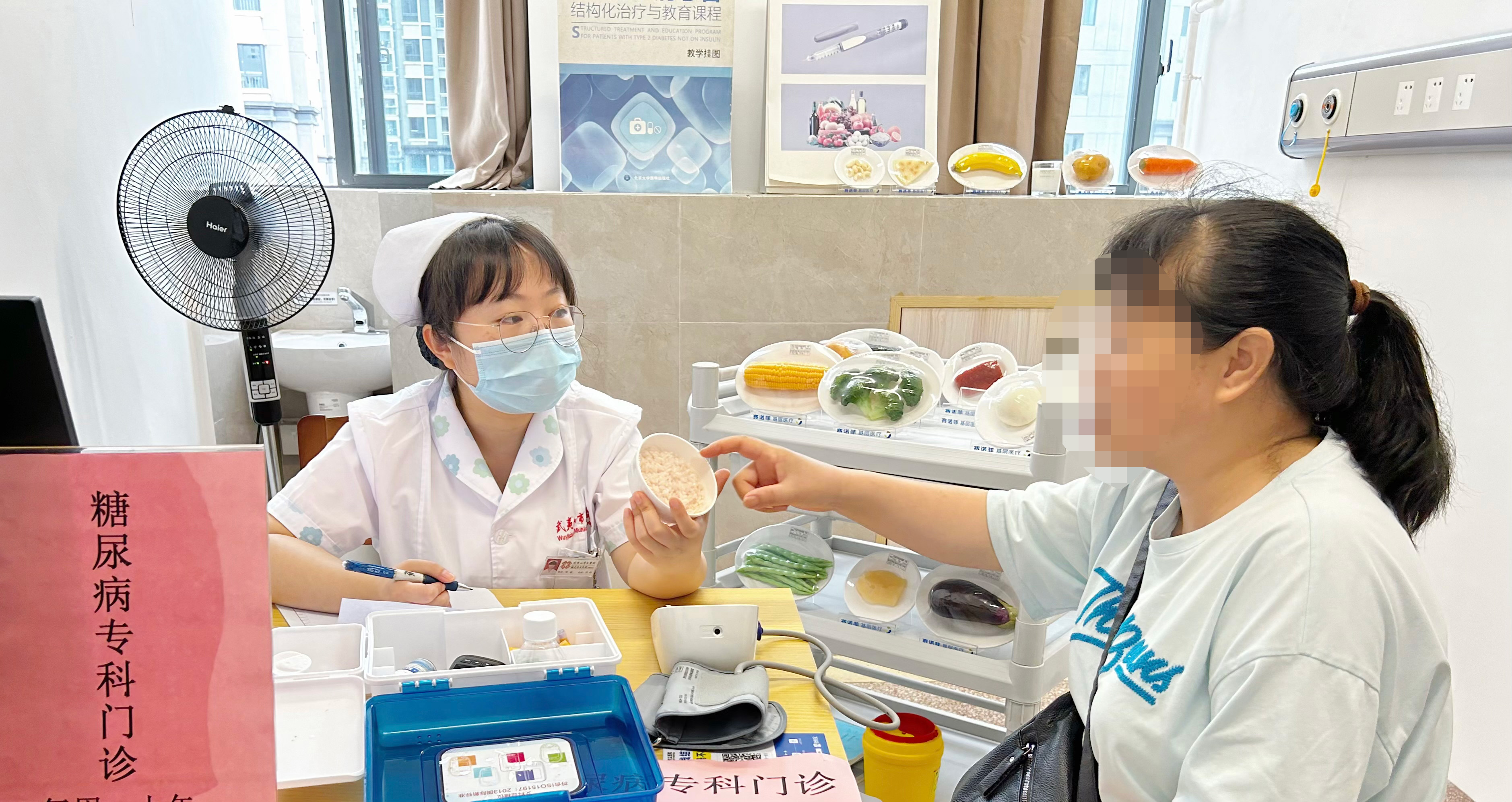 福建卫生健康新闻网讯(通讯员 王鹏靖 文/图)“张阿姨,经过计算,您每天主食可以吃200g,如果是吃熟米饭,大概一天总量是您2到3个拳头的量,鱼肉、猪肉等肉类的量可以吃到您的手掌大小、小拇指厚度的2块,蔬菜每天可以吃一斤左右……”7月25日,在武夷山市立医院北院区二楼糖尿病专科门诊,出诊护士张敏正拿着食物模型,细致地为前来问诊的糖尿病患者讲解一天的饮食量,这也成了门诊每周四上午的新场景。