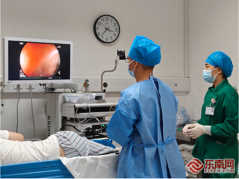 罗声政主任为患者进行肠镜检查。东南网记者 潘月容 摄 市民唐先生突发腹痛两天,前往宁德市医院就诊,完善腹部CT等相关检查后明确诊断急性阑尾炎伴局限性腹膜炎,医生建议立即手术切除阑尾;但唐先生惧怕麻醉及手术,遂通过上海市第一人民医院宁德医院常驻专家、消化内科科主任罗声政了解到,可以通过ERAT术治疗阑尾炎。知悉本技术几乎无创伤后,唐先生立即决定接受ERAT手术治疗。 9月3日下午,罗声政为患者唐先生在无麻醉条件下实施了ERAT手术。术中,在结肠镜下进行阑尾腔插管、造影,通过阑尾腔冲洗和引流脓液,清理出阑尾腔内大量脓液及粪石,反复冲洗至清净,留着一根引流管,手术顺利结束。该手术解除了患者病痛,达到治疗阑尾炎的目的,并起到立竿见影的效果,半小时后唐先生腹痛明显缓解。