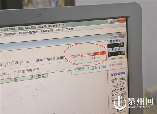 点击“一次挂号管三天”选项,病人后面两天接诊不再收取挂号费。 只需缴一次挂号费 市民看病省钱又省心 日前,记者前往泉州市第一医院城东分院。在门诊一站式服务中心,几位志愿者正在指引患者到其挂号科室所在楼层,针对需要检查或后续可能需要复诊的患者,志愿者还为其细心介绍“一号管三天”的服务。 记者与一位排号等待的患者聊起了天。谢女士是泉州本地人,她说:“我有缺铁性贫血,周三下午时我来医院血液内科就诊,医生说需要先做医学影像检查,检查结果第二天才能出来。今天周五我有空,就来拿报告并复诊,不用再次缴费,感觉省钱又省心。” 在门诊二楼的内分泌科,副主任医师牟伦盼正在为一名糖尿病患者诊治,在诊断结束后,他在电脑上勾选了“一号管三天”的服务。“在我们科室就诊患者中患慢性病的较多,包括糖尿病、甲亢、痛风等。甲亢患者如果下午来就诊,可能第二天才能拿到报告单,我们会根据其结果数据再给他开药;而针对糖尿病人,我们会根据血糖调整药量,在观察第二天或者第三天的血糖值后再作调整,这些都适用于‘一号管三天’。这个服务在就医便捷性上得到较大提升,能有效减少患者就医时间和金钱负担。”牟医生说。 据悉,8月15日该院就在内分泌科、肿瘤内科、血液内科、感染科、风湿科、放疗科、小儿外科/疝外科、疼痛科、胸外科、神经外科10个科室先行试点“一号管三天”,8月29日又扩增至全部诊室。首诊医生对符合条件的患者,在医生工作站选择“一号管三天”选项,病人基本信息列表会同步显示为“管三天”,后面两天接诊的医生读卡时将不再收取挂号费。符合条件的患者三天内跨院区也可享受“一号管三天”便民服务。 多家医院开启试点 提供优质诊疗服务 “一号管三天”便民举措实施以来,我市各县(市、区)多家医院也开启了试点。 泉州医高专附属人民医院进一步优化门诊就诊流程,改造医院诊疗信息系统,并通过医院官方微信等加大宣传,让有需求的市民患者知晓。该院门诊部王主任表示:“政策实行以来,有效解决产科、儿科等就诊患者一次看病多次挂号的问题,让患者就医省钱又高效。” “有时来晚了,检查结果当天出不来,第二天复诊只需要重新预约产科医生,不用再交挂号费(诊察费),方便多了。”妊娠6个多月的孕妇李女士说,平时因家人忙碌,她多是自己定期来人民医院做产检,此前来医院一次看不完,隔天来预约挂号还得再交一次诊察费,比较麻烦,现在有“一号管三天”,不用急着赶做检查,在心情上也觉得更放松。 在洛江区医院门诊楼一站式服务台,记者看到,现场有不少志愿者正在为患者介绍普通门诊“一次挂号管三天”就诊流程,并引导患者到相应科室问诊。“以前检查结果当天出不来,第二天复诊还要重新挂号,实在是不方便,现在一次挂号管三天,这个对我们患者来说不仅节省了挂号费,更重要的是节省了很多时间。”前来医院复诊的彭小姐告诉记者。 记者了解到,自9月2日起,在洛江区医院普通门诊全面实行“一次挂号管三天”便民举措,更好地改善患者就医体验,提高门诊服务效率。为提高患者就医体验,洛江区还推行“无陪护”病房、预缴金当日退返、节假日(周末)专家门诊等相关政策。 近期,晋江市医院(上海六院福建医院)聚焦群众就医流程,打破传统诊疗模式,制定“一次挂号管三天”便民服务工作方案。为确保政策顺利运行,晋江市医院进一步优化门诊就诊流程,改造医院诊疗信息系统,并组织医务人员开展相关培训,熟悉流程设计。 泉州市正骨医院也积极贯彻该项惠民措施,为群众提供优质诊疗服务。 缓解看病“三长一短” 减轻群众就医负担 记者从泉州市卫健委了解到,9月2日起,我市在全市二级及以上公立医院普通门诊全面实行“一号管三天”便民就医新举措。“一号管三天”即普通门诊(不包括急诊、多学科诊疗门诊、特需门诊和上级专家门诊、跨科室就诊等)患者就诊当日因检查、检验不能完成或不能获取报告等原因导致本次门诊诊疗未能完成的,在三日内(含首次就诊当日),携检查、检验结果到同一医院(含不同院区)、同一科室、同一级别或下一级别医师会(复)诊时,享受免缴普通门诊诊察费(挂号费)。 在具体实行过程中,政策要求,普通门诊患者因本次就诊的检查检验项目不能完成、接诊医师无法读取报告等原因导致本次门诊诊疗未能完成的,应及时诊间预约下一次该医师的门诊,医院应给予优先保障。预约患者携检查、检验结果在三日内(含首次就诊当日)到门诊预约复诊。确实预约不上的,由导诊护士优先将患者安排至原首诊医师,就诊当天首诊医师未出诊的,可根据当日医师的排班情况,统筹安排在同科室的其他医师复诊。 市卫健委相关负责人介绍,为贯彻落实突出问题专项整治工作,聚焦群众就医痛点难点,围绕整治工作群众身边可感可及,市卫健系统找准“多次挂号”这一“小切口”,在全市二级及以上公立医疗机构推行这一惠民政策,并鼓励其他公立医院、民营医疗机构参与。 目前,这一就诊模式“切口”虽小但成效显著,节省患者费用近两百万元,有效缓解了群众在看病就医过程中“三长一短”(挂号排队长、就诊排队长、缴费排队长、看病时间短)的难题,切实减轻群众看病就医负担,增强群众看病就医获得感。(泉州晚报融媒体记者 邱丰 许奕梅 