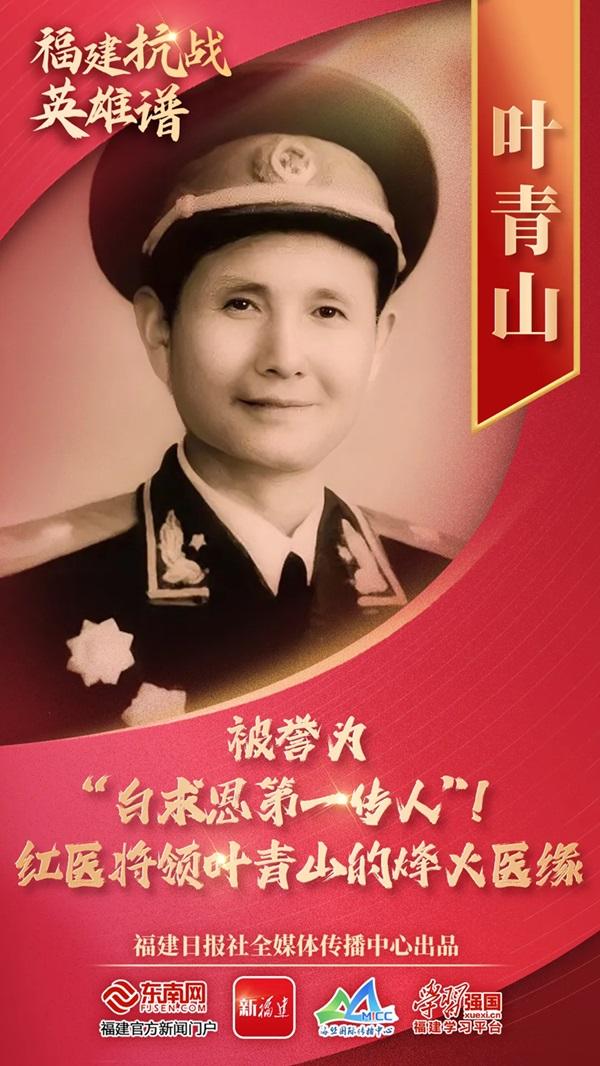 叶青山(1904年-1987年7月11日),原名叶志泉,福建省长汀县河田镇人,中国人民解放军卫生事业的创始人之一。1929年参加中国工农红军,同年加入中国共产党。抗日战争时期,历任八路军115师军医处处长、晋察冀军区卫生部长,曾和白求恩同志一起创建晋察冀军区模范医院,参与筹建医务学校,后任晋察冀野战军卫生部政治委员、华北军区卫生部副部长。1955年授予少将军衔,荣获二级八一勋章、一级独立自由勋章、一级解放勋章。 叶青山 抗日战争期间 他用手术刀和药箱 在血火交织的年代 筑起一道“生命防线” 以热忱投身于抗日斗争中 抗日战争初期 叶青山历任 八路军一一五师军医处处长 晋察冀军区卫生部部长 参加组织了平型关战斗 和百团大战的战地救护工作 在任军区卫生部部长之初 面对百废待举的边区卫生局面 很快建立和健全各级卫生行政组织 亲自挑选人员组建军区卫生部 和所属分区卫生部 开拓发展了晋察冀边区 医疗卫生事业的新格局 在晋察冀敌后根据地 他带头献血抢救伤员 冒着生命危险 到敌占区搜集药材器械 受到毛泽东、萧克、罗瑞卿等的赞扬 被称为“白求恩第一传人” 叶青山与白求恩的烽火医缘 1938年6月17日,加拿大共产党员、世界著名的胸外科医生白求恩,自延安奔赴晋察冀军区。叶青山随同聂荣臻热情地欢迎这位国际战友,并聘请白求恩担任军区的卫生顾问。 初到边区,白求恩对敌后根据地的情况不了解,在初到晋察冀军区工作的一段时间里,对军区的卫生部指责、批评多,对工作的要求常常脱离实际可能。叶青山满怀对国际主义战友的情谊,总是热情关心他的生活,尊重他的意见,积极配合、协助他开展工作,想尽办法向他介绍边区的实际情况,一次次消除误会,筑牢理解根基。 当白求恩了解到边区医务人员少、技术低,不适应战争的需要,倡议并亲自主持创办军区“模范医院”的工作。在创办军区“模范医院”过程中,叶青山也倾尽全力。从医院的选址、房屋的清理到设备的购置、人员的配备,以及医院工作人员的食、住、行等方面都进行了周密的研究和部署。“模范医院”设在离军区卫生部8里以外的松岩口,叶青山每日往返,既要指导医院的工作,又要协助白求恩做手术,每天忙至凌晨才能休息。 “模范医院”建成后,白求恩在一次手术中,见到伤员失血过多生命垂危,便示意让一名看护员输血,可那位看护员因害怕而拒绝了,叶青山见状,主动上前,挽起衣袖说:“我是〇型血,输我的!”350毫升鲜血经过白求恩带来的三通注射器从叶青山的血管流进了伤员的血管,这是晋察冀军区首例施行输血。据勤务员高华回忆,仅四个月,叶青山为伤员献血四次。 叶青山的举动,让白求恩深受触动,他常常伸出拇指赞叹说:“我到过世界上许多地方,可从没有像在中国见到这样伟大而高尚的人,中国人民真是伟大的了不起的人民。” 白求恩逝世后,叶青山悲痛万分,亲自为其安葬,组织隆重的悼念活动,并在晋察冀边区大力宣传白求恩的事迹,号召八路军医务人员学习白求恩的共产主义、国际主义精神,毫不利己、专门利人的高尚品格。