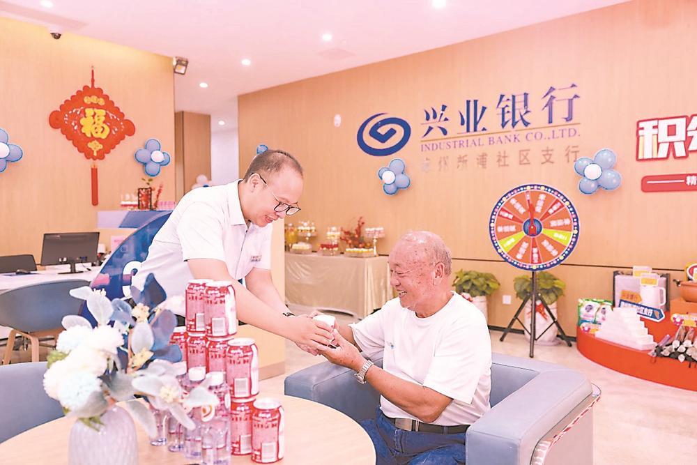 兴业银行厅堂工作人员为老年人办理养老金融业务。