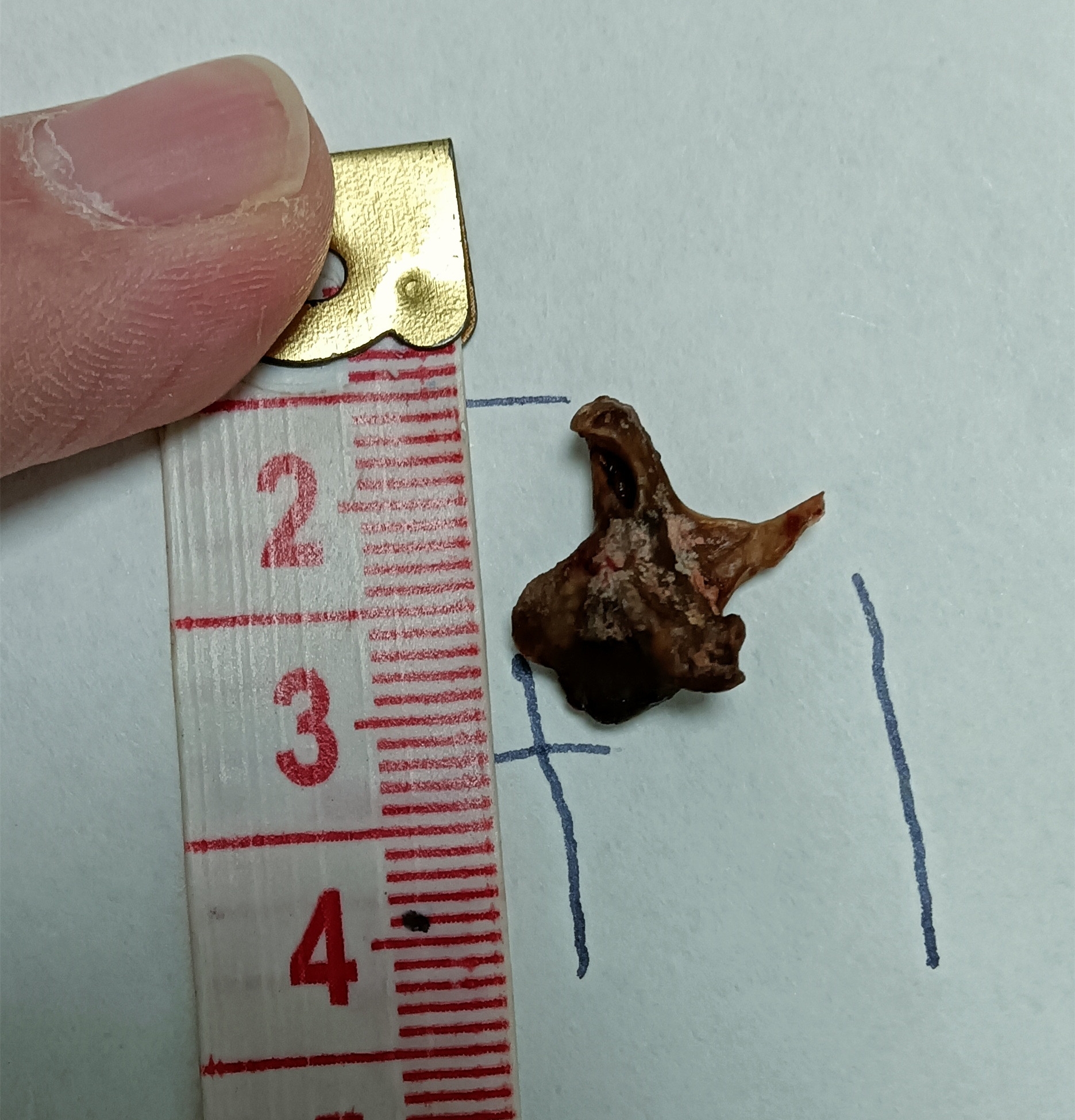 十六年来,老阿婆备受鸡骨卡喉折磨,异物一直刺激气管黏膜,导致老太太反复咳嗽、气促,气管堵塞,排痰受限,反复诱发肺部感染,生活质量明显下降。因病入住重症医学科后,重症医学科顾凌主任医师、施云弟副主任医师带领团队开展病例讨论,考虑患者是由于鸡骨头嵌顿致气管堵塞、肺部脓肿形成,需立即取出鸡骨头,病情才能得以改善。诊疗方案经征得患者家属同意后,经舒海林副主任医师、陆通安主治医师等多位医生通力合作,运用床边纤支镜检查发现,鸡骨头形态不规则,久经年月,部分骨头被气管黏膜包被。医生们尝试纤支镜负压吸引、网篮、异物钳等多种方法,为降低对气管黏膜、血管的损伤,在有限的空间内进行小幅度的活动,每个动作都小心翼翼,多次调整角度,异物逐渐松动,经过四个小时的努力,最终将1.6×1.2厘米的鸡骨取出。经过一个多月的抗感染、化痰、抗炎、辅助排痰等综合治疗,患者咳嗽、气促明显改善,生命体征稳定,2月20日康复出院。