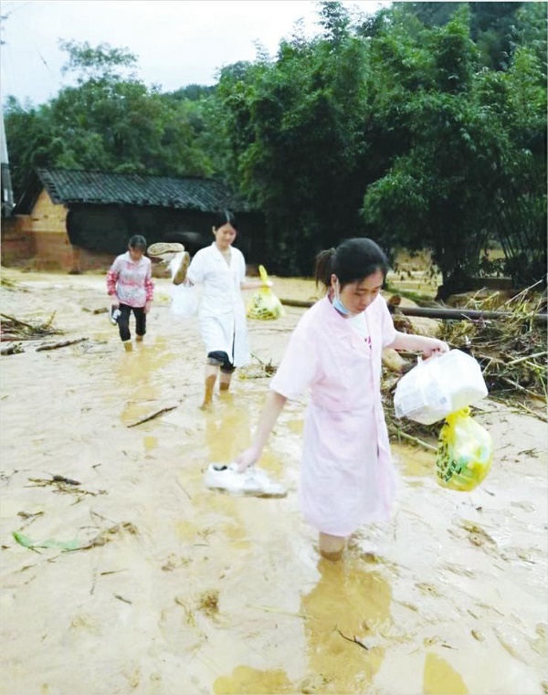 截至6月19日16时,上杭县卫生健康局组织全县卫生健康系统救治各类伤病员105人。图为该县溪口镇卫生院医务人员跋山涉水为群众送医送药。